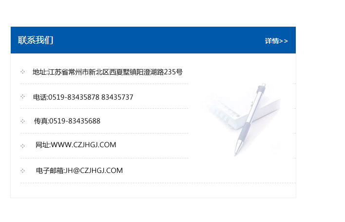 地址:常州市新北區友邦商務大廈1幢16、17層  電話:0519-85101652  傳真:0519-85112595  郵編:213022  網址:www_cz-jiayue_cn.hnjyts.com  郵箱:xiajifengaa@163.com